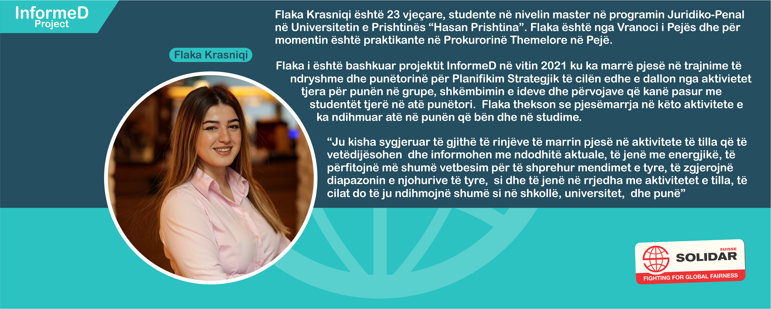 Kemi kënaqësinë të ndajmë me juve storiet e suksesit të studentëve pjesëmarrës në projektin InformeD. Njihuni me studentët tanë të shkëlqyer përmes storieve të tyre të suksesit.